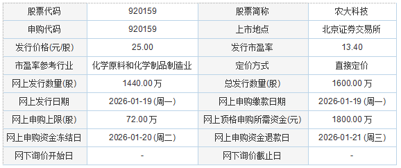 农大科技2026年1月15日披露的向不特定合格投资者公开发行股票并在北京证券交易所上市发行公告显示,若这次发行成功,预计公司广泛征集资金总额40,000.00万元,扣除发行费用4,193.44万元(不含增值税)后,预计募集资金净额为35,806.56万元。